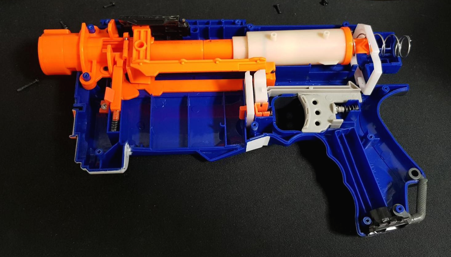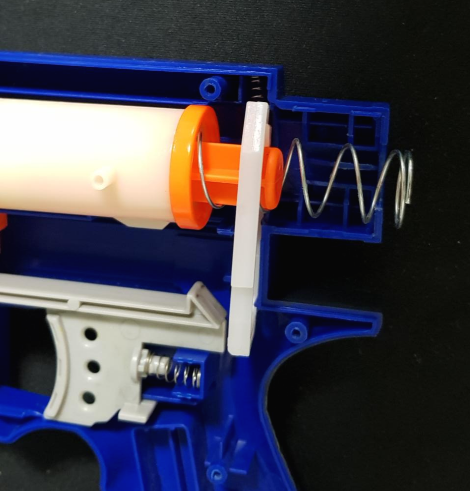 장력이 강하기 때문에 순정 홀드 스프링이 너프건의 7kg 장력을 견디지 못해 장전이 안된다.