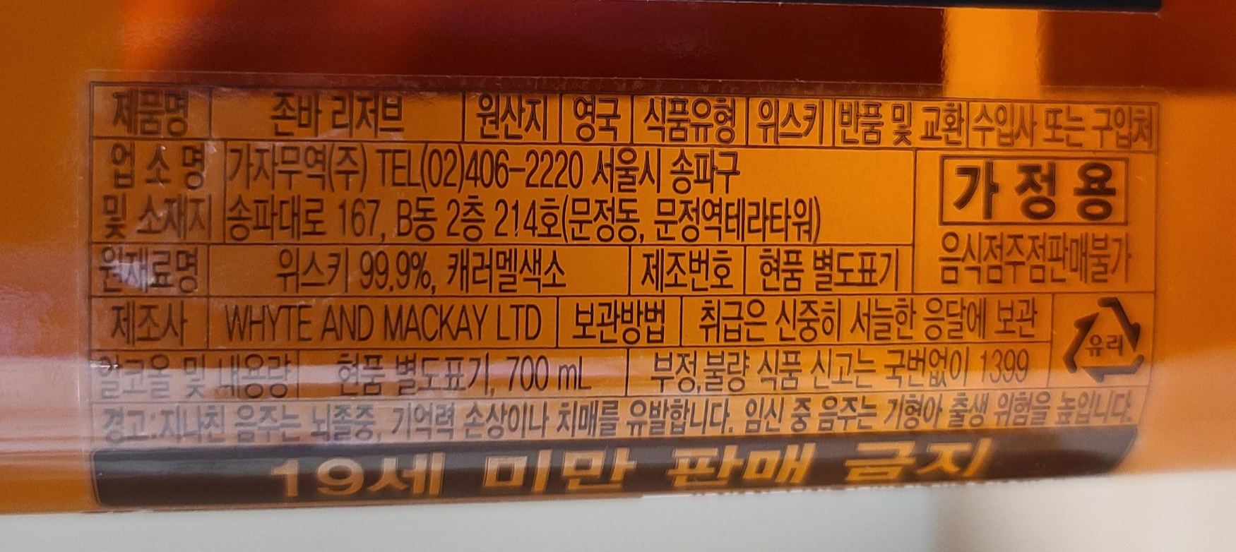 원재료명 : 위스키 99.9%, 캐러멜색소
